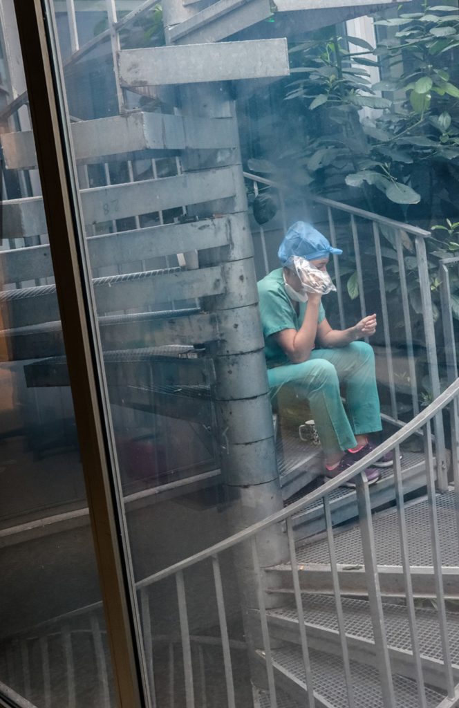 C’est à cet auteur unanimement reconnu qu’a fait appel l’Assistance Publique – Hôpitaux de Paris (AP-HP) pour témoigner du travail remarquable des équipes soignantes, en particulier de celles des salles de réanimation. Il en résulte une série d’images qu’Eric Bouvet a appelée à juste titre « Sur le front » et, qui – sans aucun voyeurisme – présente le dévouement de ces soignants au service des victimes de la pandémie.