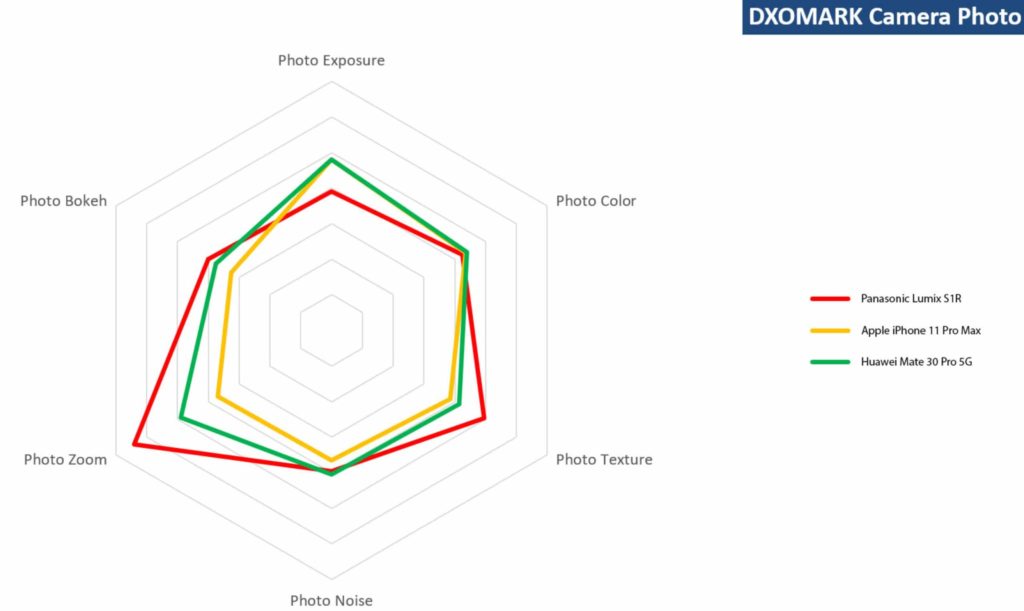 Nous incitons vivement nos lecteurs à prendre connaissance de cette présentation. Dans ce but, nous reproduisons ici un de ses graphiques, qui illustre le fait qu’alors que l’appareil photo plein cadre Panasonic avec son capteur 47,3MP et son objectif Leica APO-Summicron-SL 35 mm choisi pour le test l’emporte sur la préservation des détails et du téléobjectif, les flagship d’Apple et de Huawei de leurs côtés offrent des performances globales impressionnantes, et sont en fait égaux ou supérieurs au reflex numérique en précision d’exposition, rendu des couleurs, mise au point automatique et faible bruit. (Image: DxO Mark)